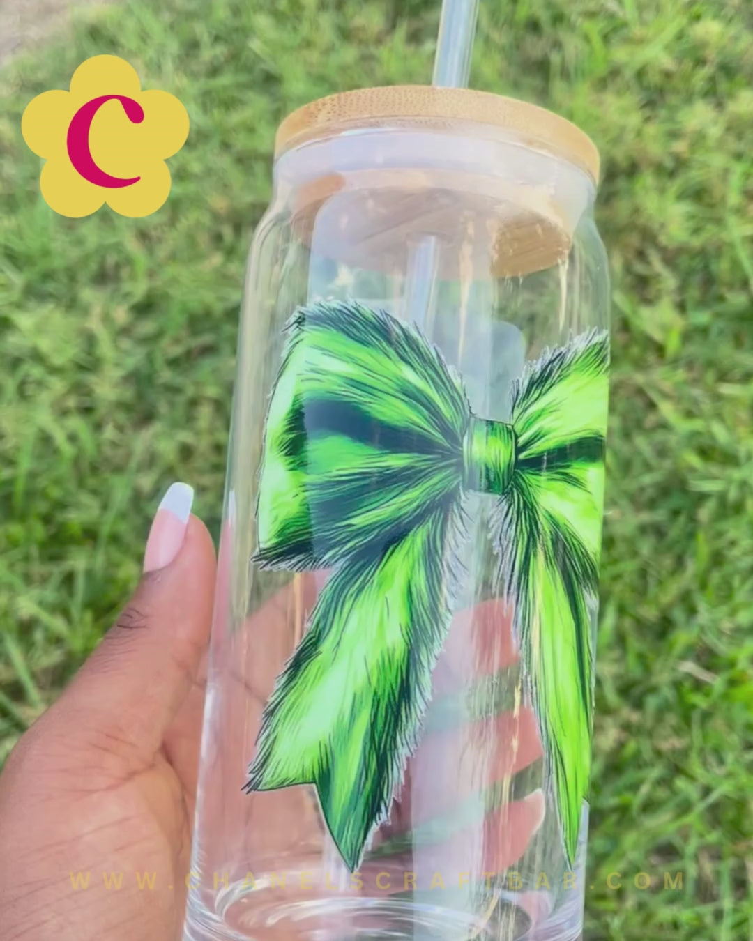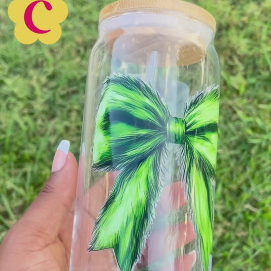 Grinch Bow 20oz Glass Cup with Bamboo Lid + Straw